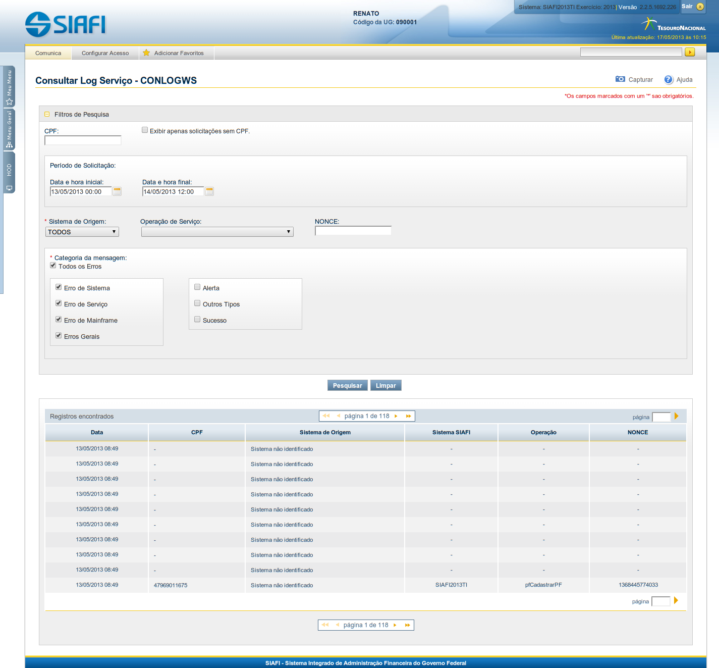 Para consultar a tabela "Log de Serviços Web", que contém o histórico dos serviços requisitados ao SIAFI via sistemas externos por meio da Internet, preencha os campos do bloco Filtros e clique no botão "Pesquisar".