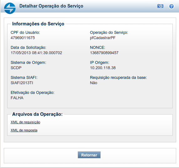 Nesse formulário, você visualiza em detalhe um registro da tabela "Log de Serviços Web", podendo solicitar a exibição do conteúdo dos arquivos XML de requisição e de resposta dos Serviços Web disponíveis no Sistema SIAFI.