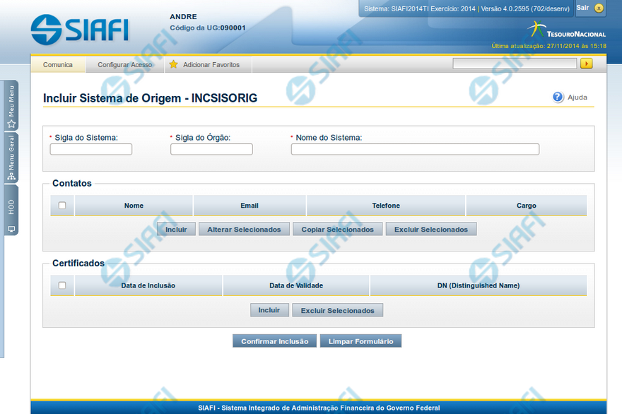 O mesmo formulário da inclusão é o apresentado nas operações de alteração e reinclusão de Sistema de Origem, com algumas particularidades descritas na seção "Campos" abaixo. Neste formulário você deve preencher os campos obrigatórios, pelo menos um contato e pelo menos um certificado.