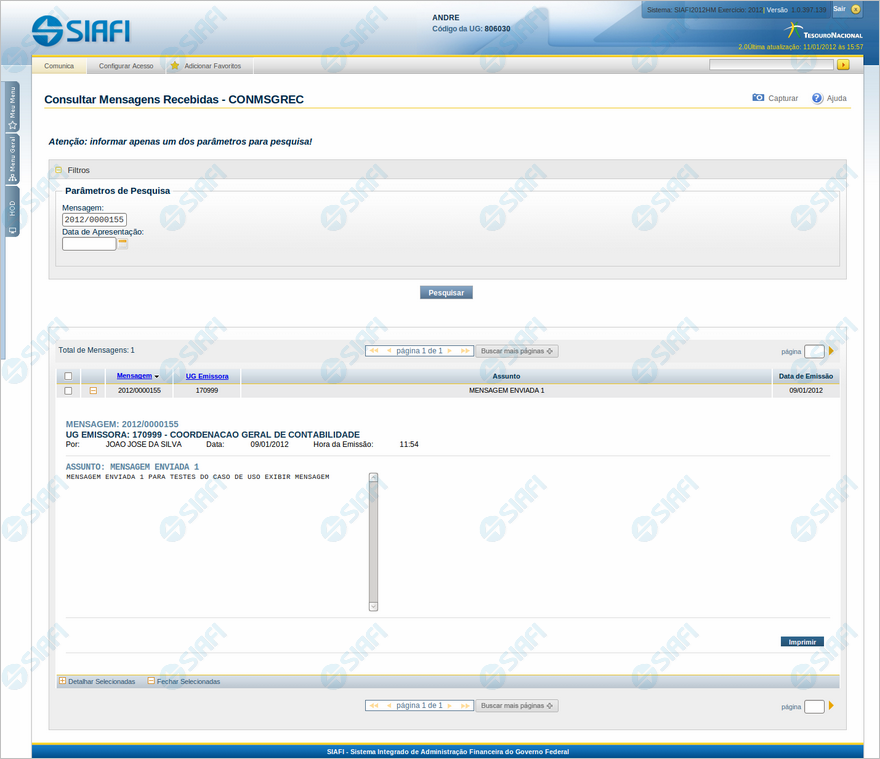 de lotação do Usuário SIAFI responsável pelo envio da mensagem.
