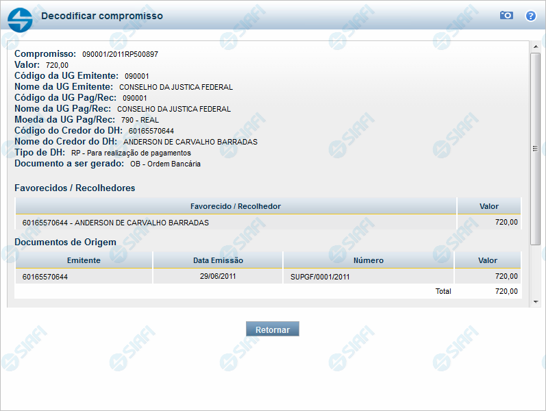 Código do Credor do DH - Código do credor do Documento Hábil. Pode ser um CNPJ ou um CPF. Esse campo é exibido se o compromisso consultado for de natureza Pagamento.