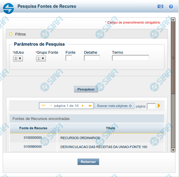 Pesquisar - Clique nesse botão para comandar a pesquisa da tabela "Fonte de Recurso", atendendo aos parâmetros que você informou. Caso você não informe nenhum parâmetro, serão apresentados todos os registros da tabela.