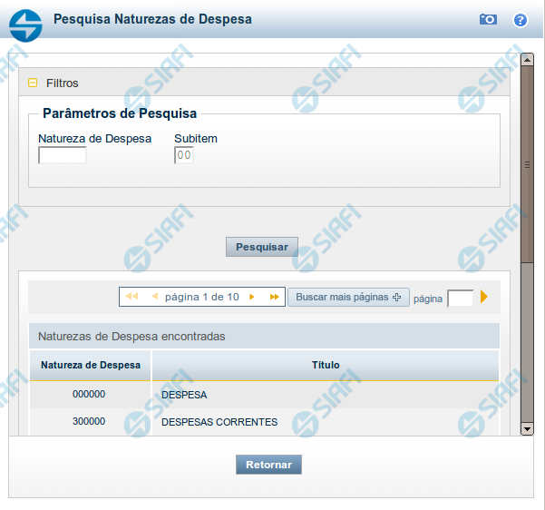 Pesquisar - Clique nesse botão para comandar a pesquisa da tabela "Natureza de Despesa", atendendo aos parâmetros que você informou. Caso você não informe nenhum parâmetro, serão apresentados todos os registros da tabela.