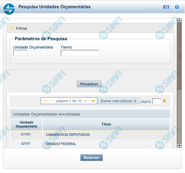 Pesquisar - Clique nesse botão para comandar a pesquisa da tabela "Unidade Orçamentária", atendendo aos parâmetros que você informou. Caso você não informe nenhum parâmetro, serão apresentados todos os registros da tabela.