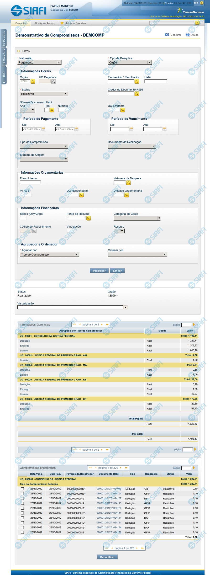 Apresenta o demonstrativo dos compromissos encontrados para os critérios de pesquisa, com as totalizações dos valores monetários de compromissos, de acordo com o agrupamento que você solicitou.