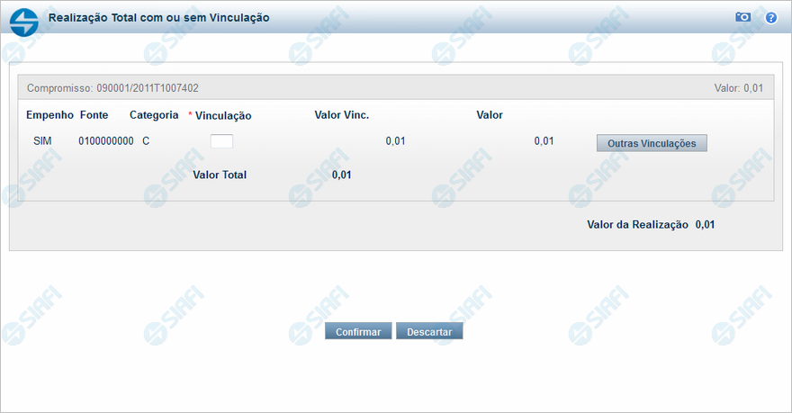 Outras Vinculações - Clique neste botão, caso deseje informar mais de uma vinculação de pagamento para esse compromisso.