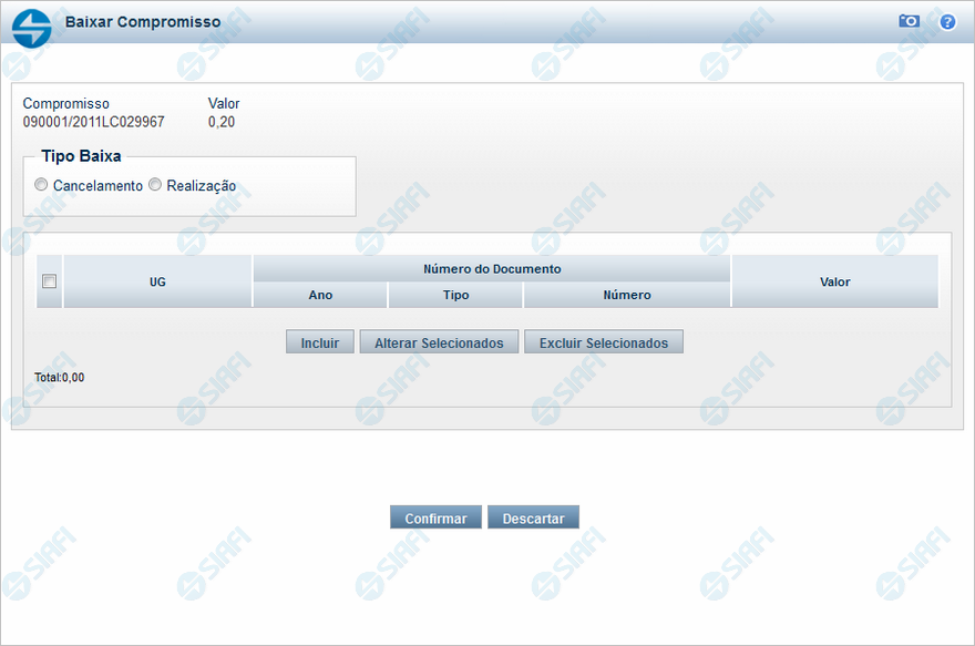 - Clique no botão "Confirmar" para dar prosseguimento à ação de baixa de compromisso, com os documentos de baixa já preenchidos;