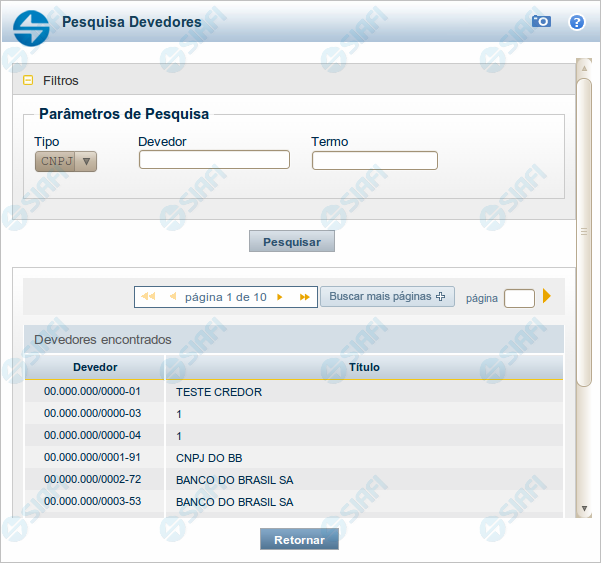 pesquisa é uma lista de Devedores que atende aos parâmetros