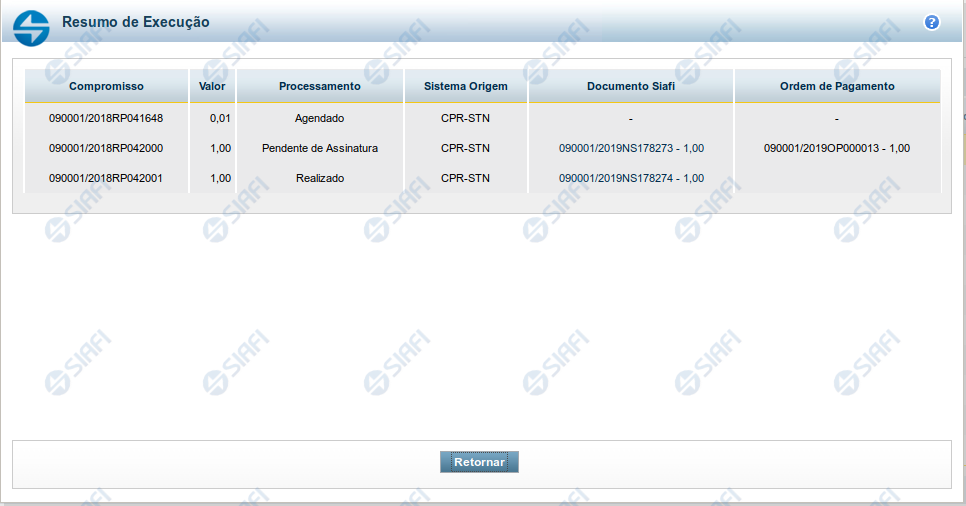 Documento SIAFI- exibe o código do Documento SIAFI gerado como resultado do processamento do compromisso junto com o valor do compromisso associado ao documento SIAFI.