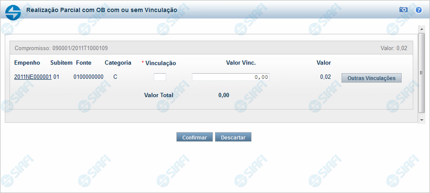 Quando você solicita a realização parcial de um compromisso com OB que exija vinculação de pagamento, o sistema apresenta esse formulário para que você informe o código da vinculação e a parcela do valor a ser realizado.
