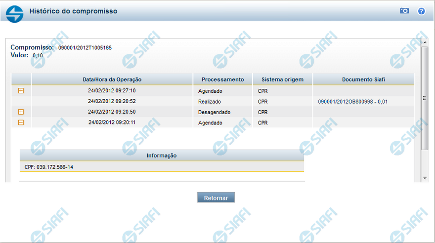 Este campo é um link que permite acessar o detalhamento do Documento SIAFI ou da Programação Financeira (quando o documento for PF) gerados a partir de uma das seguintes operações: Realização Total, Realização Parcial, Realização fora do CPR, Cancelamento fora do CPR e Restabelecimento de Compromisso devido a Cancelamento online ou batch.