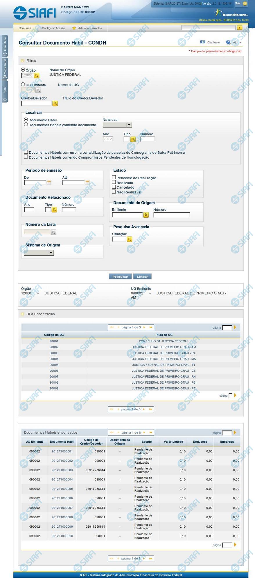 Cada item da lista é um link que, quando clicado, exibe uma lista com todos os Documentos Hábeis emitidos pela UG sobre a qual você clicou.
