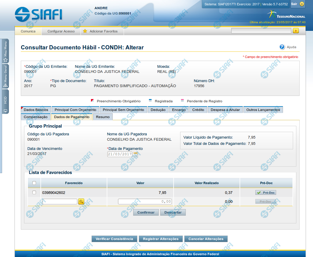 Favorecido- código do favorecido do líquido do Documento Hábil atual.