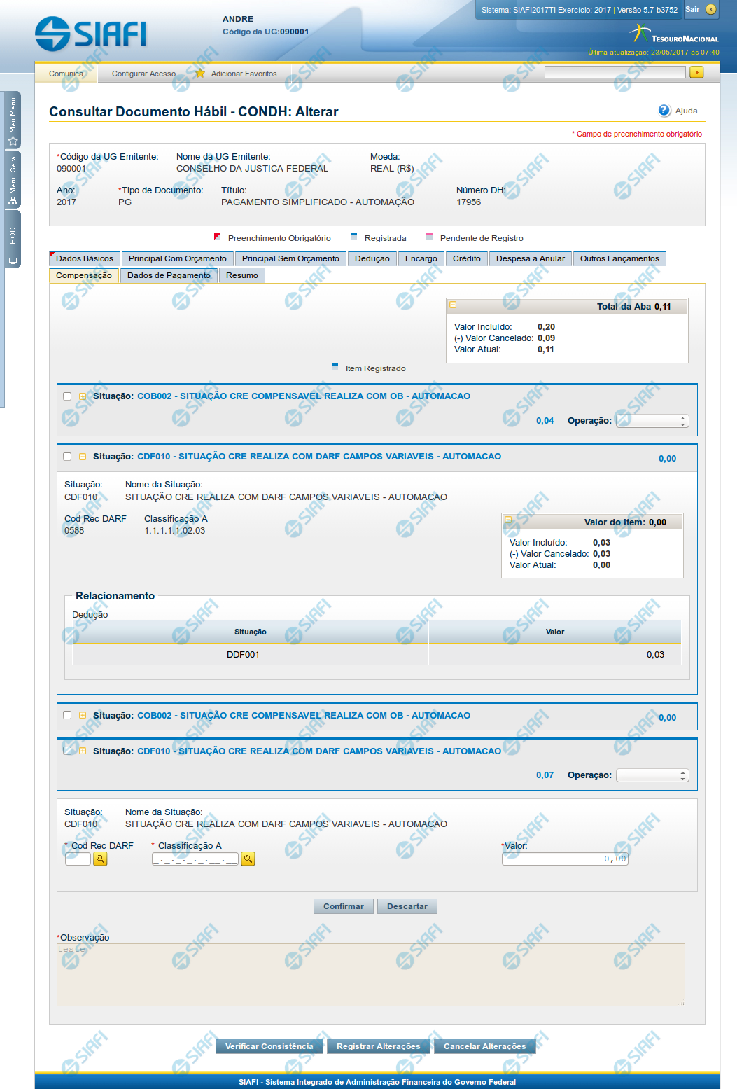 Observação- contém informações utilizadas para compor os documentos SIAFI a serem gerados no momento do registro do Documento Hábil.