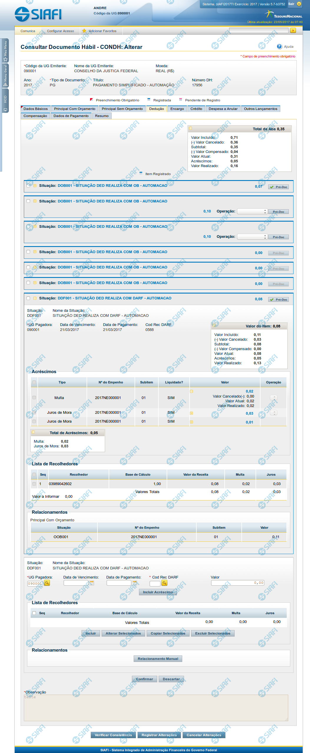 Os itens de Dedução são apresentados em agrupamentos de campos, cujo conteúdo pode ser expandido ou ocultado. Para cada Situação de Dedução existe um item de agrupamento. Dependendo do código de Situação também pode ser apresentada, dentro do agrupamento, uma tabela contendo itens de Acréscimos, outra composta por itens de Recolhedores e outra exibindo os relacionamentos do item de Dedução com itens de Principal com Orçamento, Principal sem Orçamento e Crédito.