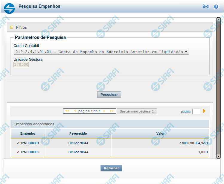 Pesquisar - Clique nesse botão para comandar a pesquisa da tabela "Empenho", atendendo aos parâmetros que você informou. Caso você não informe nenhum parâmetro, serão apresentados todos os registros da tabela.