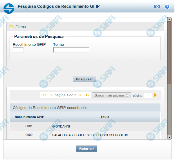Pesquisa Códigos de Recolhimento GFIP