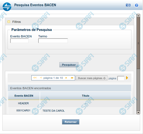 Eventos BACEN encontradas - Tabela contendo a lista de registros retornados pela pesquisa, constituída pelas colunas descritas a seguir. Clique em um dos campos dessa lista para selecionar o registro desejado.