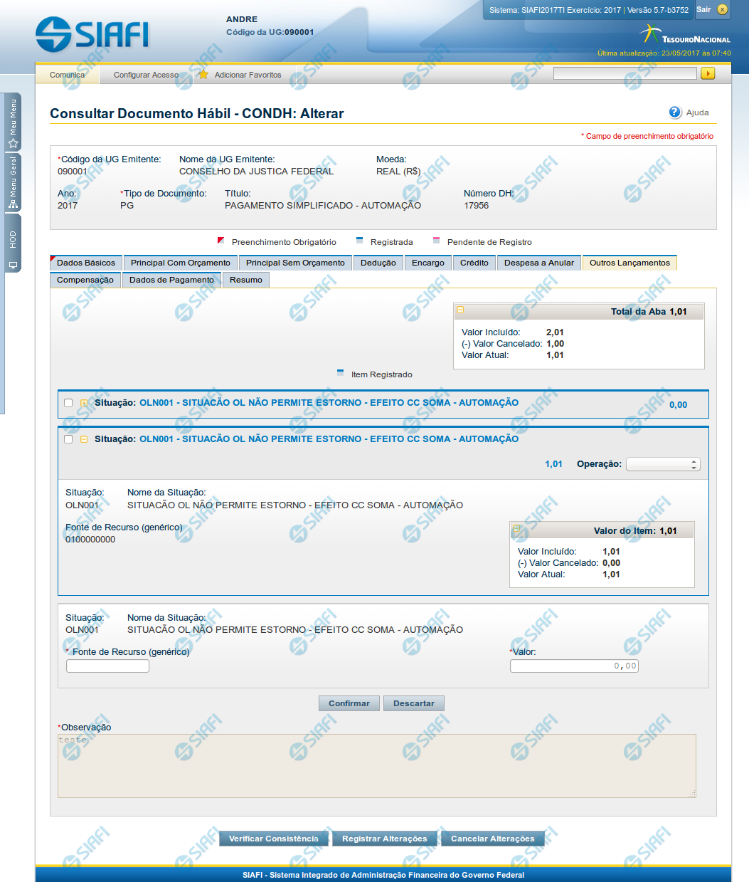 [campos variáveis] - representa um conjunto de campos configurado especificamente para cada Situação de Outros Lançamentos, que informa os componentes orçamentários do item sendo registrado. O número e os tipos de dados a serem apresentados varia para cada Situação.