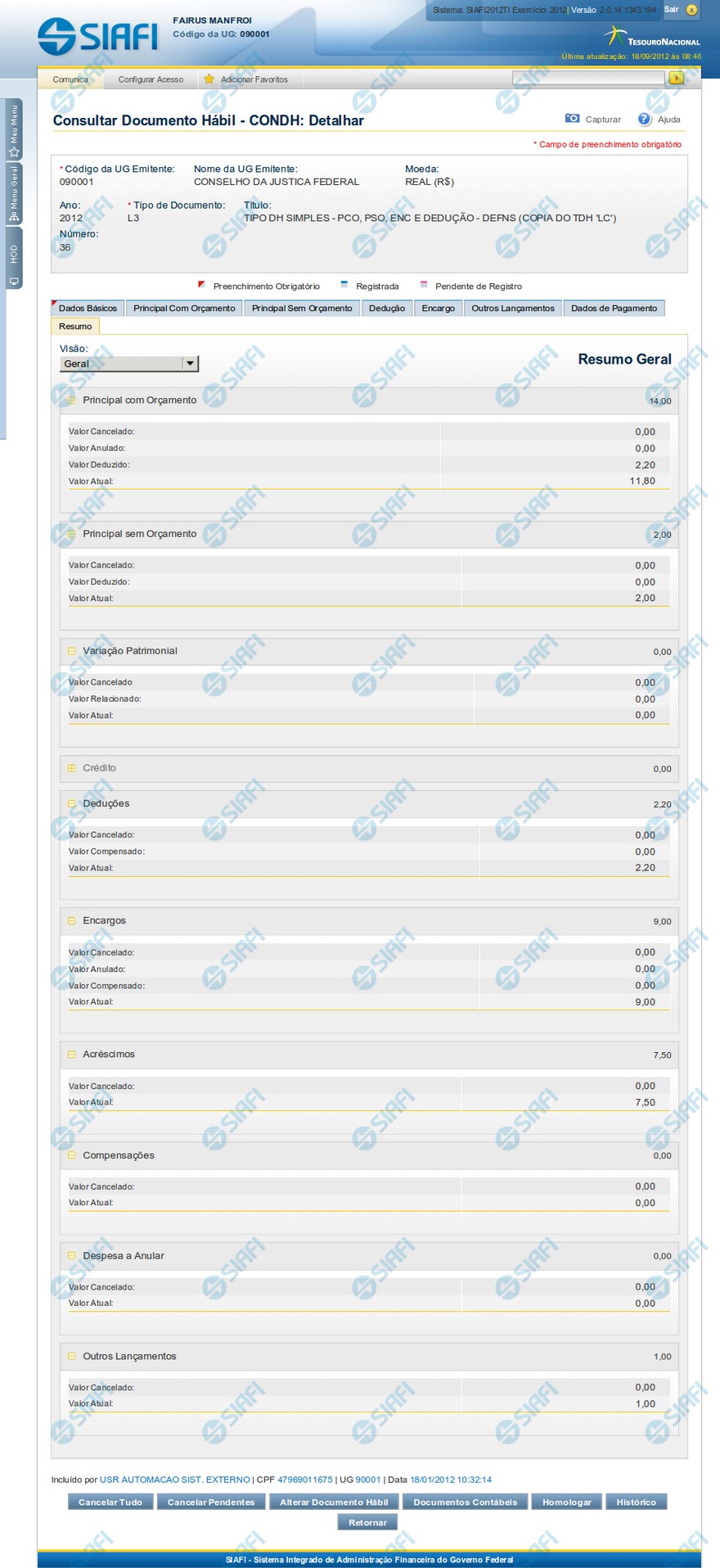 O sistema exibe o resumo dos valores lançados, classificando-os e exibindo-os em separado, para cada aba existentes no respectivo Documento Hábil, que podem ser: