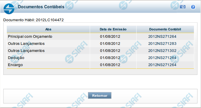 Relaciona os documentos contábeis que foram gerados nas diversas contabilizações pelas quais um Documento Hábil tenha passado.Ela é apresentada quando você aciona o botão Documentos Contábeis, no formulário de detalhamento de um Documento Hábil.