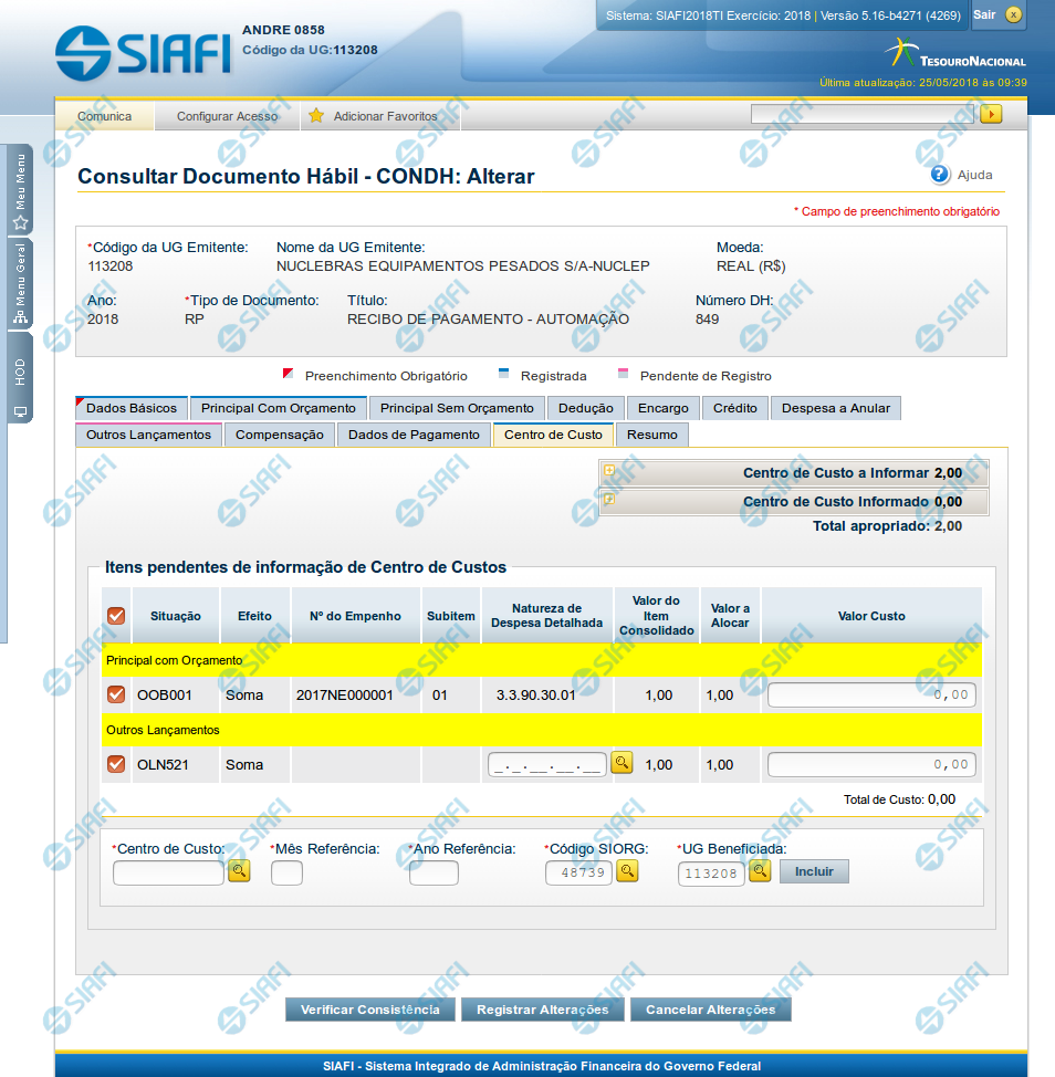 Quando o Documento Hábil estiver sendo editado, os itens para os quais seja necessário informar os códigos de Centro de Custo são listados numa seção "Itens pendentes de informação de Centro de Custos". Os Centros de Custos que já foram informados são listados em outra seção, que também exibe os itens do Documento Hábil associados ao código de Centro de Custo que os consolida.