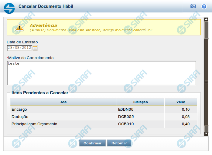 O sistema apresenta uma mensagem de advertência informando-o de que o DH atual já foi atestado ou homologado, quando for o caso, dando-lhe a oportunidade de desistir do cancelamento dos itens pendentes.