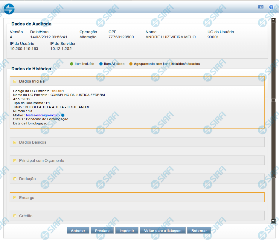 Nesta seção são listados os dados armazenados, para efeitos de auditoria, da entidade cujo histórico está sendo detalhado. Tais informações são capturadas automaticamente e registram dados do usuário logado no momento em que a operação sobre a entidade foi registrada e do computador a partir do qual tais operações foram realizadas.