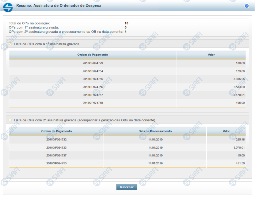 - Lista de OPs com a 2ª assinatura gravada (acompanhar a geração das OBs no próximo dia útil): exibe uma tabela com os campos 'Código da OP', 'Data de Processamento' e 'Valor';