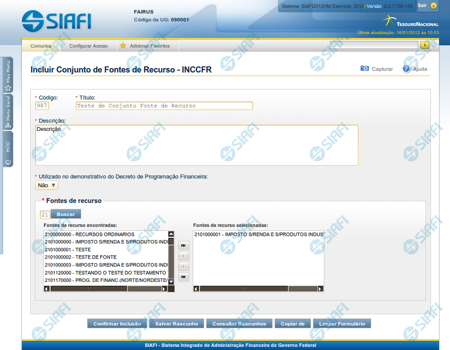 Incluir Conjunto de Fontes de Recurso