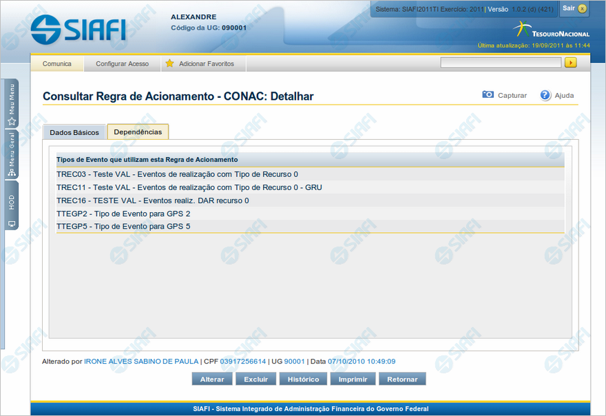 Tipos de Evento que utilizam esta Regra de Acionamento - Lista