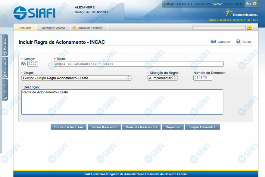 Código - Informe o código da nova Regra de Acionamento. Observe