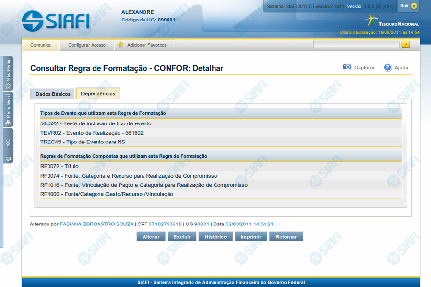 Exibe em detalhe um registro da tabela "Regra de Formatação de Evento" e possui duas abas: "Dados Básicos" e "Dependências".