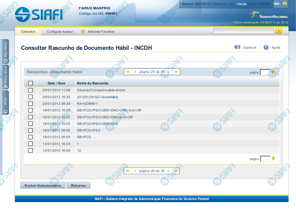 Este formulário é apresentado ao ser acionado o botão Consultar Rascunhos e lista os registros de rascunho que foram armazenados pelos usuários de uma mesma Unidade Gestora.