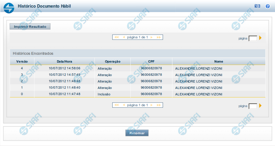 Imprimir Resultado - Clique nesse botão para gerar um documento PDF contendo as informações listadas no histórico, para posterior impressão em papel.