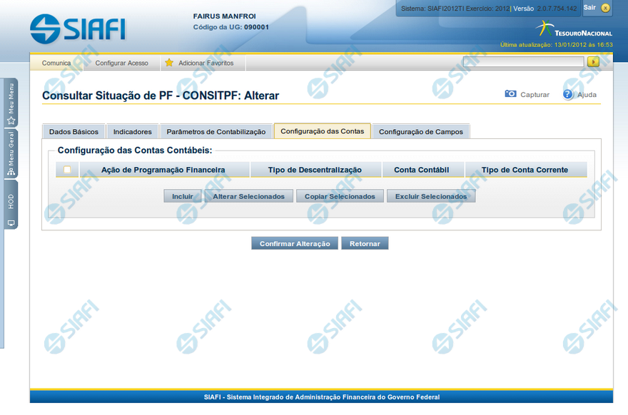 Configuração das Contas Contábeis - Tabela contendo a configuração das contas contábeis que serão usadas para o registro da Programação Financeira gerada por meio da Situação de PF atual, composta pelas colunas descritas a seguir.