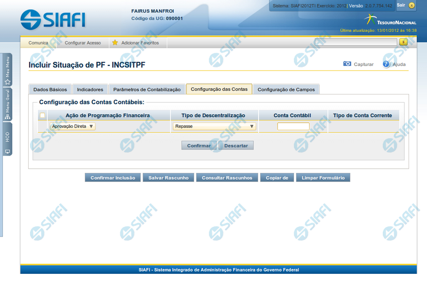 Configuração das Contas Contábeis - Tabela contendo a configuração das contas contábeis que serão usadas para o registro da Programação Financeira gerada por meio da Situação de PF atual, composta pelas colunas descritas a seguir.