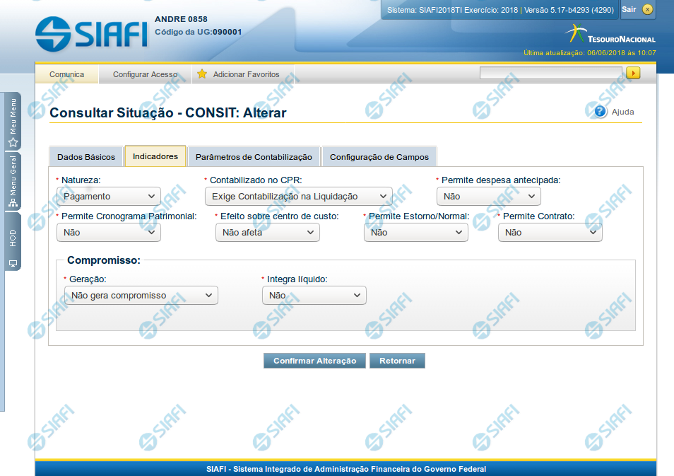 Geração - define se e como a Situação se comporta em relação à geração de compromisso. Pode ser uma destas: "Gera compromisso", "Gera compromisso consolidável", "Não gera compromisso".