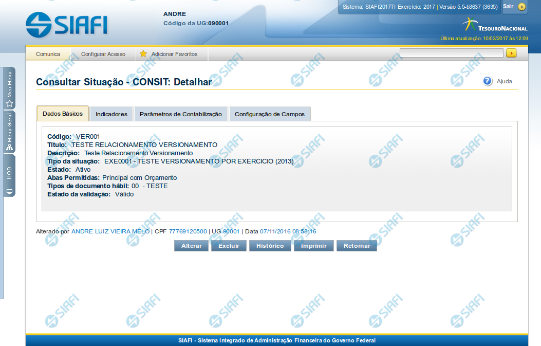 Nesse formulário, você visualiza em detalhes um registro da tabela "Situação" e possui quatro abas: "Dados Básicos", "Indicadores", "Parâmetros de Contabilização" e "Configuração de Campos".