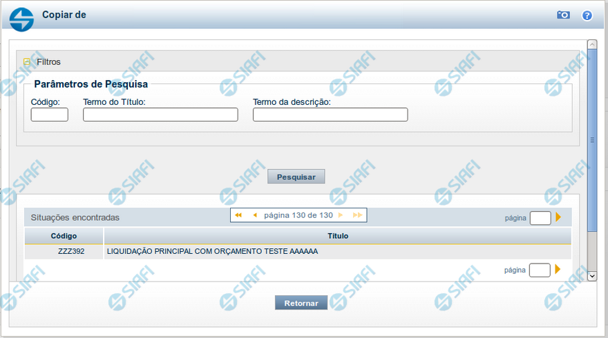 Após preencher os campos de parâmetro, clique no botão "Pesquisar" e, em seguida, clique em um dos campos da lista apresentada para selecionar o registro correspondente.