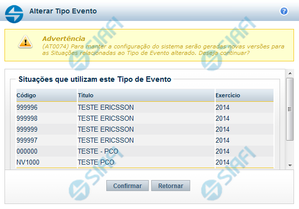 Esse formulário é apresentado quando você solicita a alteração de um Tipo de Evento com Situações vinculadas, para que você avalie o impacto dessa alteração sobre tais Situações.