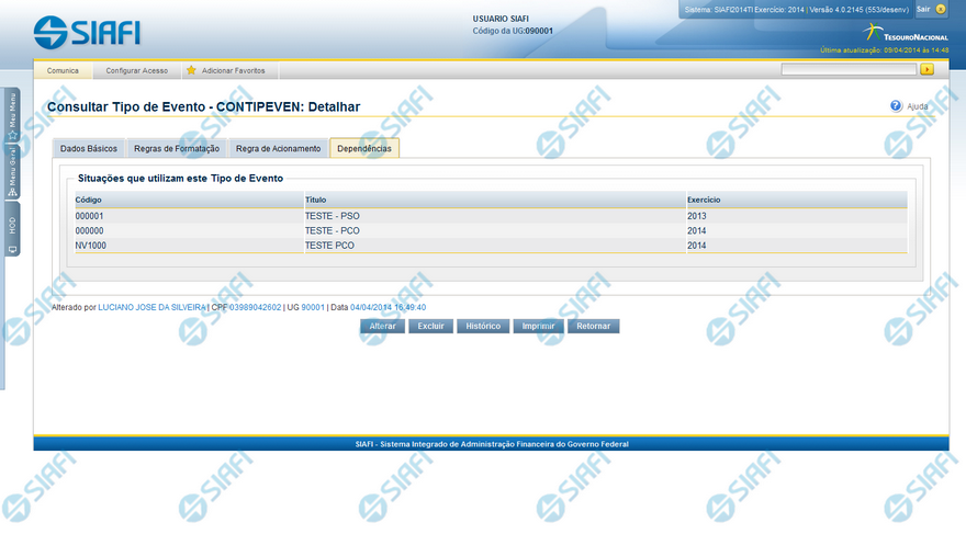 Reincluir - Se esse registro estiver excluído, em vez dos botões "Alterar" e "Excluir" descritos acima, é apresentado o botão "Reincluir". Clique nesse botão para reverter a exclusão.
