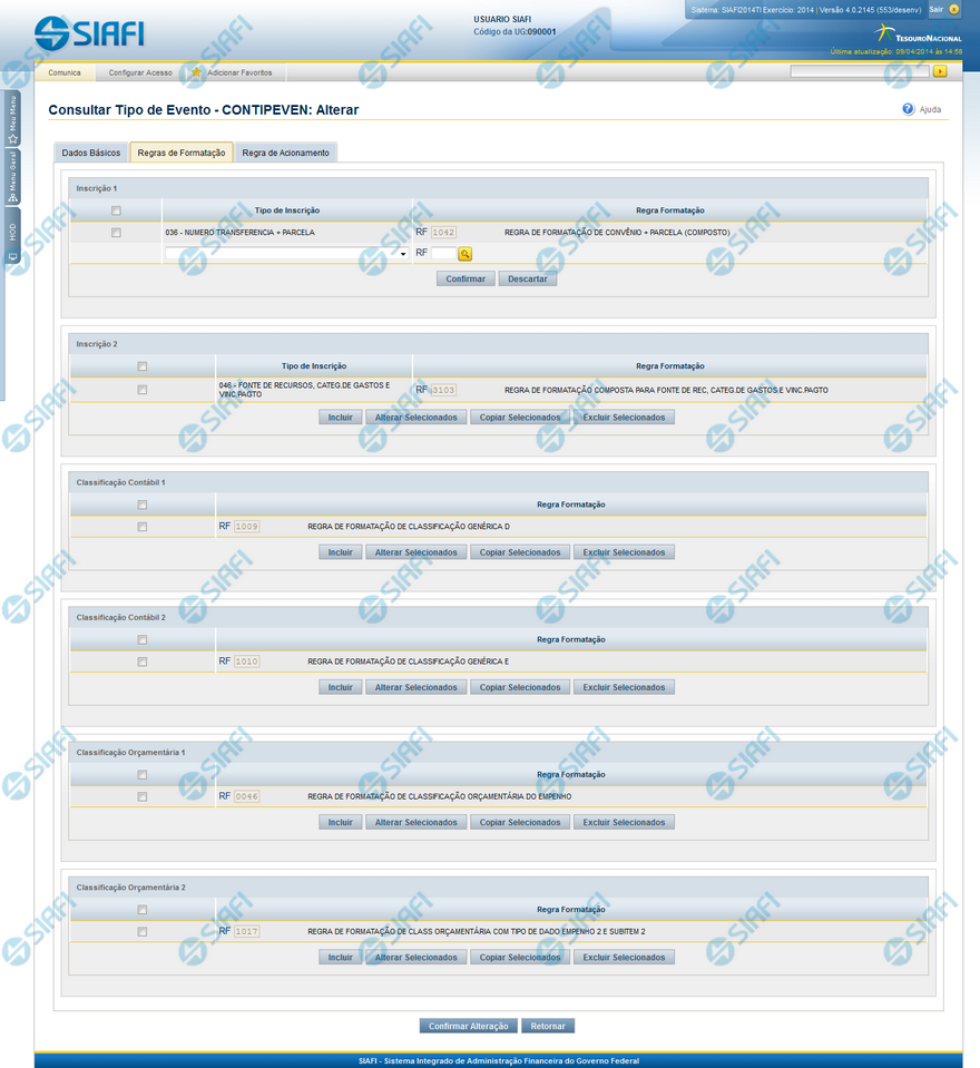 Regra Formatação - Informe o código de uma nova Regra de Formação de Evento associada ao campo "Classificação Orçamentária 1" para esse Tipo de Evento, ou mantenha a mesma. Observe que o início do código, composto pelas letras RF, já está fixado, bastando que você informe a parte numérica, contendo, no máximo, quatro dígitos. Não há necessidade de informar zeros iniciais.