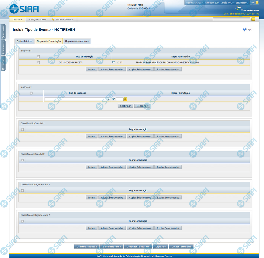 Regra Formatação - Informe o código de uma nova Regra de Formação de Evento associada ao campo "Classificação Orçamentária 1" para esse Tipo de Evento, ou mantenha a mesma. Observe que o início do código, composto pelas letras RF, já está fixado, bastando que você informe a parte numérica, contendo, no máximo, quatro dígitos. Não há necessidade de informar zeros iniciais.
