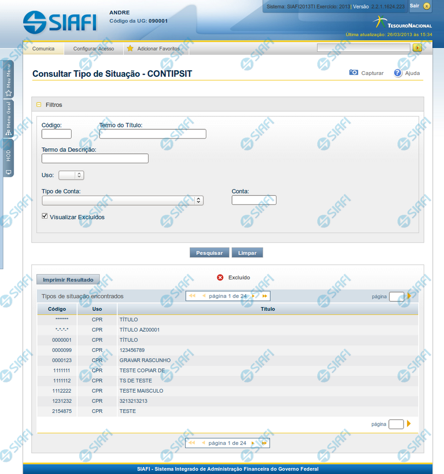 Para consultar a tabela "Tipo de Situação", preencha os campos do bloco "Filtros" e clique no botão "Pesquisar".