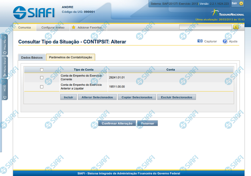 Esse formulário possui duas abas: "Dados Básicos" e "Parâmetros de Contabilização".