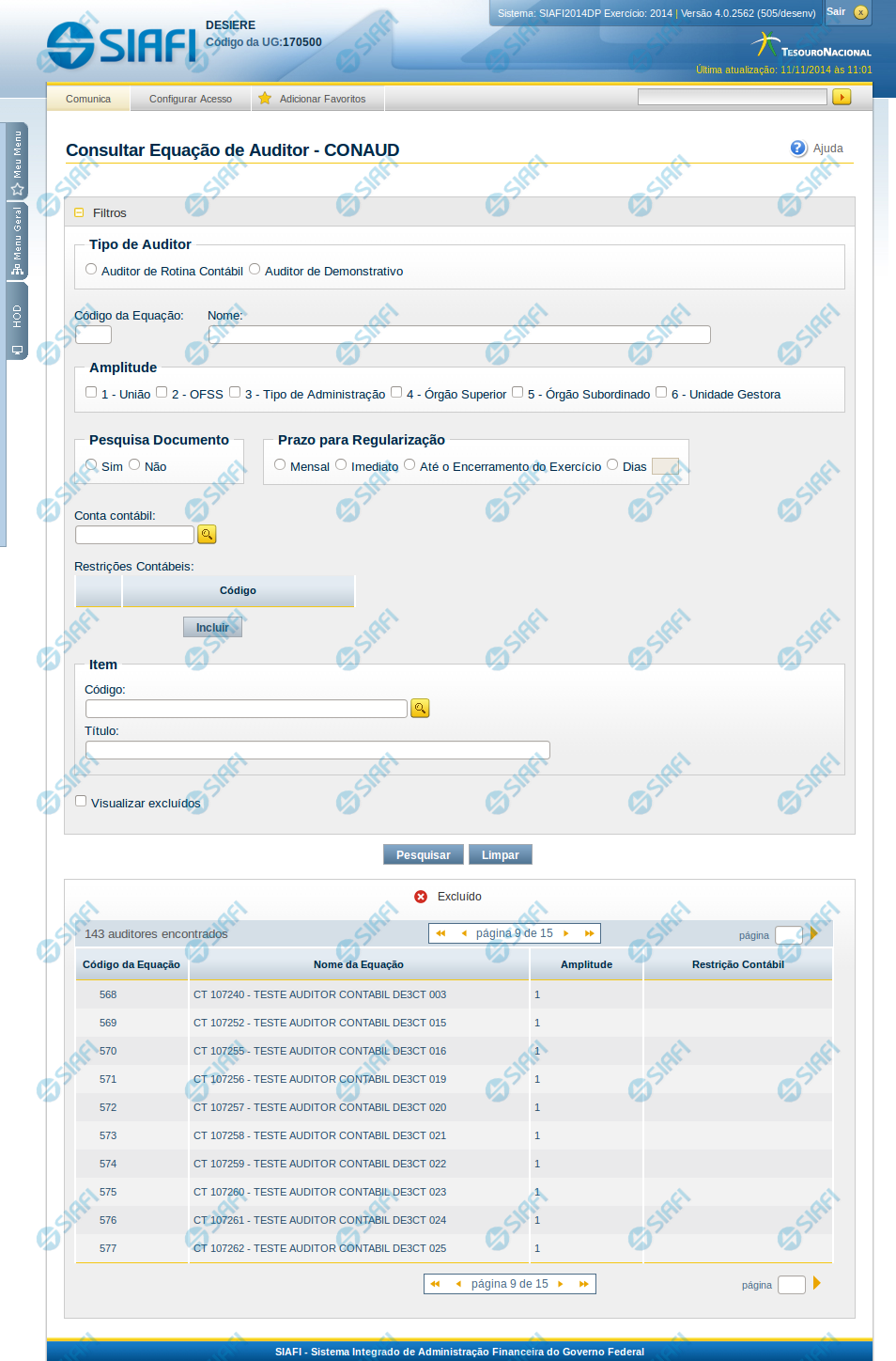 Nome - informe neste filtro um valor para pesquisar equações de auditor que possuam o nome informado. Serão retornadas as equações de auditor que possuem o valor informado em qualquer posição do nome.