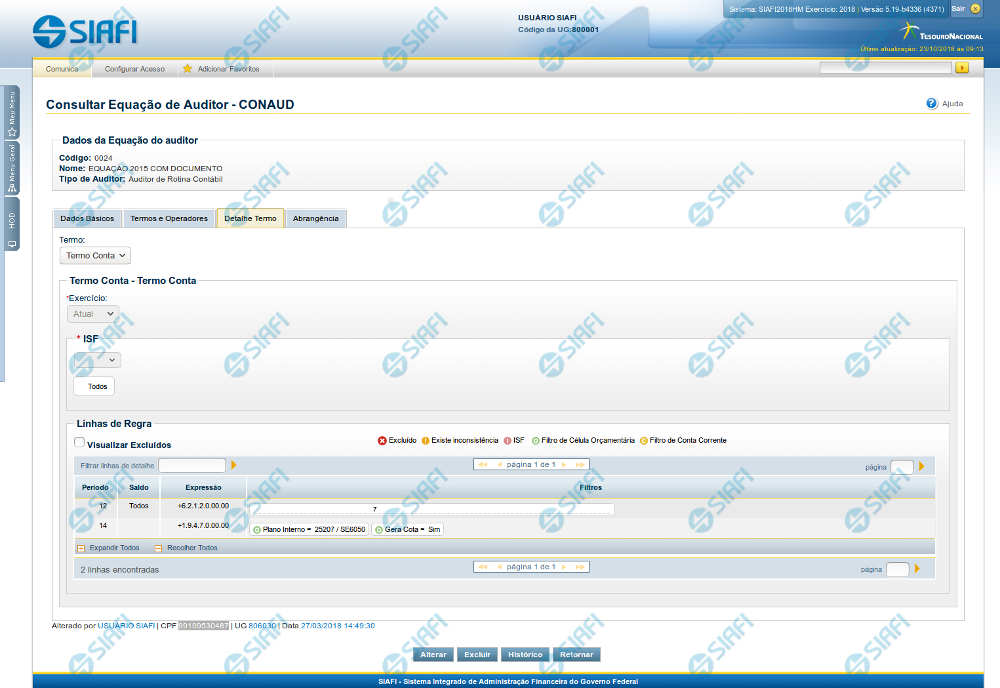 Nesta tela você pode visualizar os detalhes dos termos da equação de auditor, sem possibilidade de edição. Nesta página, além dos campos disponibilizados nas abas, também são exibidas as informações de auditoria, indicando a última edição da equação, o responsável, data e UG.