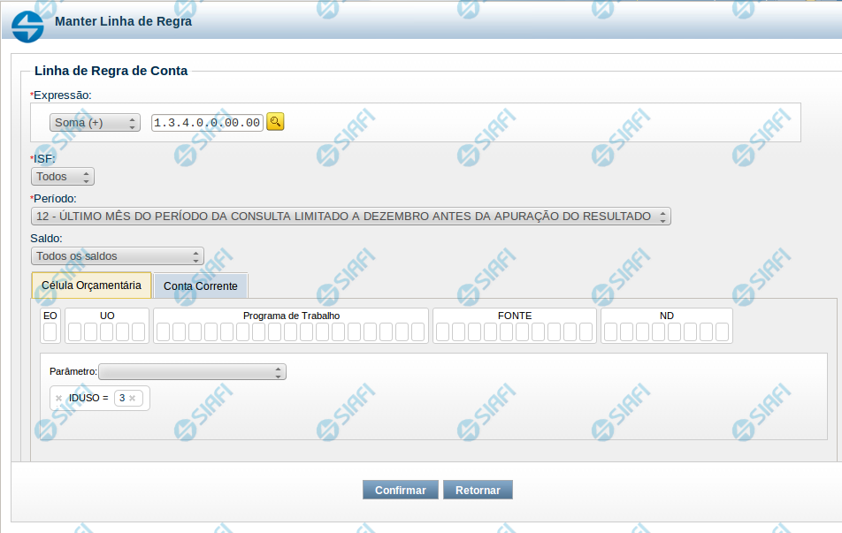 Retornar - Este botão será disponibilizado quando você selecionar para edição um parâmetro (de conta-corrente ou célula orçamentária) já adicionado em uma das abas. Você deve clicar neste botão para desfazer a alteração do parâmetro editado.