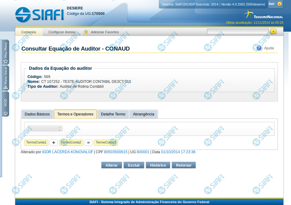 Nesta tela você pode visualizar os detalhes dos termos e operadores da equação de auditor, sem possibilidade de edição. Nesta página, além dos campos disponibilizados nas abas, também são exibidas as informações de auditoria, indicando a última edição da equação, o responsável, data e UG.